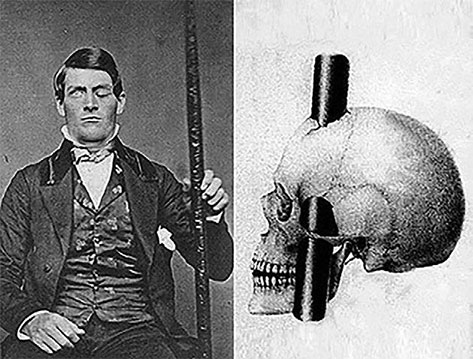 Рис. № 14. Знаменитый дагерротип Финеаса Гейджа и реконструкция травмы