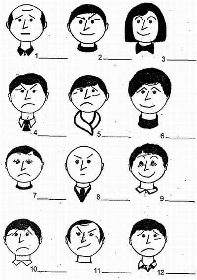 Выполним еще одно задание, его цель научиться понимать другого человека по мимическим движениям лица. Перед вами 12 картинок с изображением различных эмоциональных состояний на рис. 137, попытайтесь определить, какая эмоция показана на каждой картинке. Подпишите их.