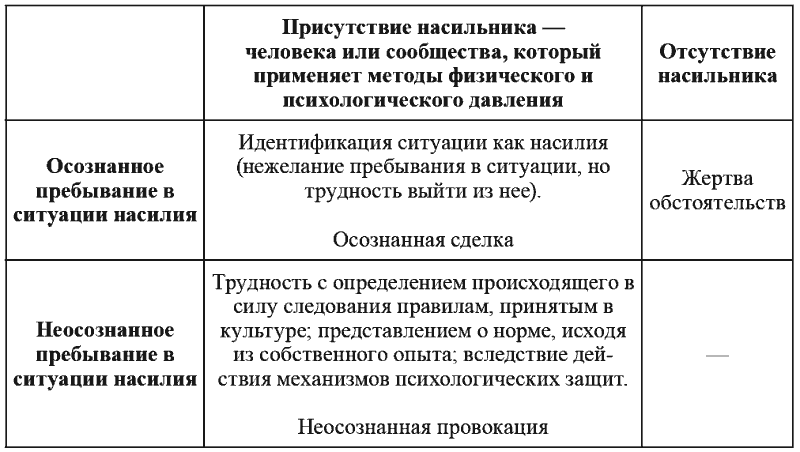 Предложенная ниже таблица описывает различные варианты восприятия насилия в зависимости от присутствия ситуации насилия и степени осознанности происходящего.
