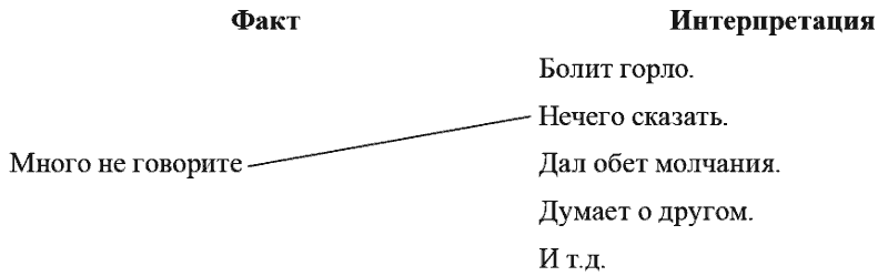 Ловушка сложной эквивалентности состоит в смешении факта и интерпретации (как субъективного представления, индивидуальной трактовки). Сложную эквивалентность бывает не просто разбить потому, что половина этой информации обычно правда (факт), а половина – интерпретация. Много не говорите – это факт; нечего сказать – субъективное мнение говорящего.