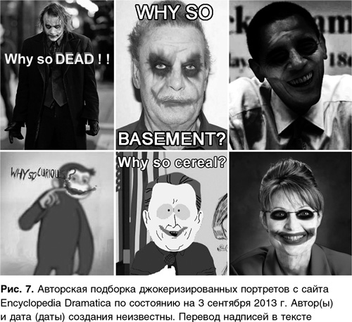 Тролли пришли в восторг от вирусной рекламы фильма, в которой Джокер писал кровью ставшую знаменитой фразу «Ты почему такой серьезный?». Созвучная правилу троллей о том, что ничего не следует принимать всерьез, фраза быстро вошла в лексикон троллей и вдохновила массу макросов (рис. 7). Все, от Майли Сайрус до Гитлера и тогда еще кандидата в президенты Обамы, получили свою «порцию Джокера», и джокеризированные изображения котят, младенцев и персонажей мультфильмов появлялись в изобилии. В зависимости от контекста «Ты почему такой серьезный?» превращалась в «Ты почему такой любопытный?» (Why so cereal? на джокеризированном изображении героя детских книжек, обезьянки по имени Любопытный Джордж), «Ты почему такой кашка?» (Why so cereal?) (отсылка к известному ляпу Эла Гора, которому на шоу Опры Уинфри послышалось cereal вместо serial), «Ты почему такой подвал?» (Why so basement) (отсылка к Йозефу Фрицлю, который держал годами в подвале и насиловал собственную дочь) и «Ты почему такой мертвый?» (Why so Dead!!) на изображениях самого Леджера{203}.