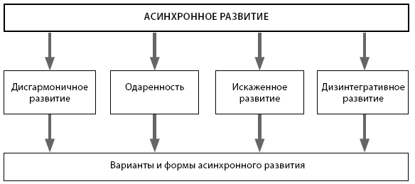 Асинхрония развития в той или иной степени присуща самым разным категориям отклоняющегося развития, то есть не является специфичной только для данной группы. Тем не менее такое обозначение именно этой группы имеет исторические основания. Во-первых, как и многие другие термины, оно пришло из детской психиатрии и было закреплено за определенной категорией психического дизонтогенеза. Термин понятен специалистам-медикам, психологам и дефектологам, используется в психологической литературе, в частности, в монографии В.В. Лебединского (1985). Во-вторых, в содержательном плане мы говорим именно об асинхронии развития всех (или некоторых) базовых компонентов структурной организации, что специфическим образом проявляется во всех сферах (регуляторно-волевой, когнитивной, аффективно-эмоциональной).