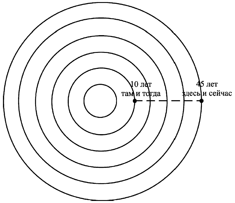 Например, у 45 летней клиентки в 10-летнем возрасте произошла какая-то травма (например, потеря значимого человека). В то время она почувствовала себя одинокой, был сильный страх, понизилась самооценка. Все это было актуально давным-давно, «там и тогда» и как бы осталось в прошлом. Сейчас у нее совершенно другая жизнь, она совершенно другой человек. Но она очень часто чувствует непонятную тревогу, страх, одиночество. Как можно рассмотреть эту ситуацию с точки зрения циклической теории времени? (вариант представлен на рис. 3.1).