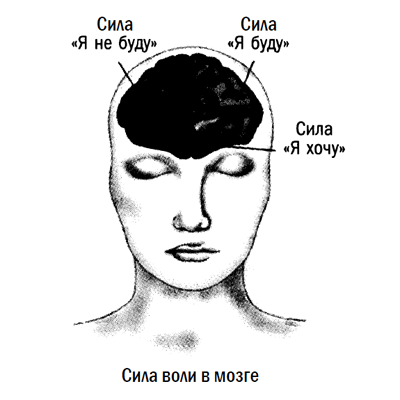 Префронтальная кора — не какая-то там клякса серого вещества: в ней есть три основные области, которые делят между собой задачи «Я буду», «Я не буду» и «Я хочу». Одна зона находится в верхней левой части и отвечает за силу «Я буду». Она помогает вам начать и продолжать заниматься скучными, трудными или напряженными делами, например оставаться на беговой дорожке, когда вы бы предпочли уже отправиться в душ. Правая сторона, напротив, отвечает за силу «Я не буду» и не дает следовать всем импульсам и желаниям без разбора. Можете поблагодарить ее за недавний случай, когда вы хотели прочитать за рулем эсэмэску, но предпочли смотреть на дорогу. Вместе две эти области контролируют то, что вы делаете.