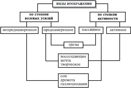 При классификации видов воображения исходят из основных характеристик – степени волевых усилий и степени активности (рис. 11).