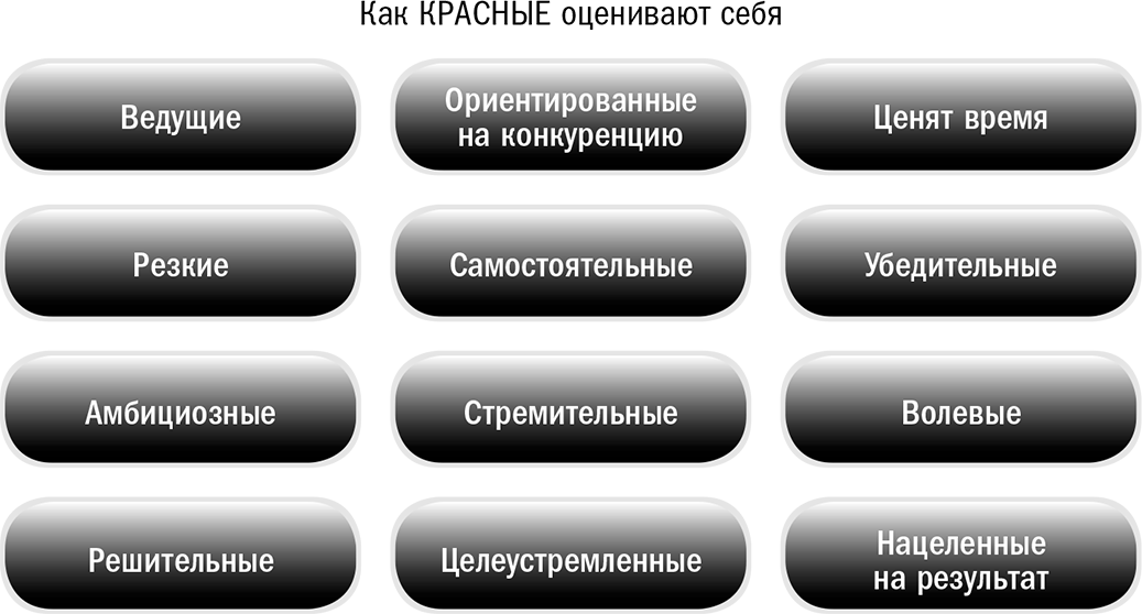 Личности, окрашенные красным цветом, ориентированы на преодоление проблем, они экстраверты и всегда готовы к вызовам. Они принимают скоропалительные решения и часто берут на себя инициативу и риски. В целом, создается впечатление, что красные – лидеры по духу. Эти люди охотно берут на себя командование и рвутся вперед. Они настолько активны, что шагают вперед, даже если кто-то или что-то стоит у них на пути. Их нрав и темперамент идеально приспособлены к конкурентным ситуациям.
