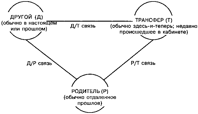 Дэвид Мэлан в качестве иллюстрации к взаимоотношениям между прошлым и настоящим приводит «Треугольник персонажей» (Triangle of Persons; рис.3.2). Он показывает, как отношения из далекого прошлого воздействуют в настоящей жизни на отношения с «другими» (к примеру, с начальником или с женой). Во–первых, существует связь «другой — родитель» (Д/Р). Прошлое также изменяет и отношения с терапевтом: это связь «терапевт — родитель» (Т/ Р). Мэлан использует слово «трансфер», обозначая им на своей схеме «Т(ерапевта)», поскольку рассматривает лишь процесс, происходящий в терапевтическом кабинете (Malan, 1979:80).