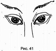 Человек, у которого внешние уголки глаз приподняты (рис. 41), не отличается критическим восприятием. Общаться с ним легко, он не склонен язвить и придираться к мелочам. Однако он не умеет увидеть за мелочами многообещающих перспектив. Поэтому не стоит слишком полагаться на его суждения и советы.