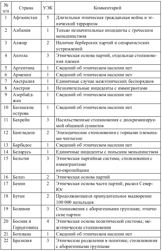 Оценки уровня этнических конфликтов (УЭК; от 1 до 5 баллов) за период 2003-2011 годов в 176 странах