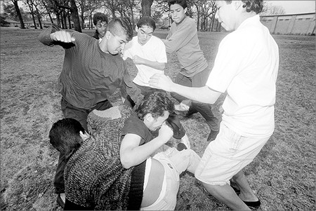 •Избиение.14-летний Майкл Калогрис провел три недели в больнице Лонг-Айленда. Мальчик получил многочисленные внутренние повреждения во время проводившейся в «адскую ночь» церемонии посвящения в школьном братстве «Омега Гамма Дельта». Так называемые братья устроили Майклу «атомную бомбу» — приказали ему поднять руки над головой, а сами тем временем наносили кулаками удары по его животу и спине.