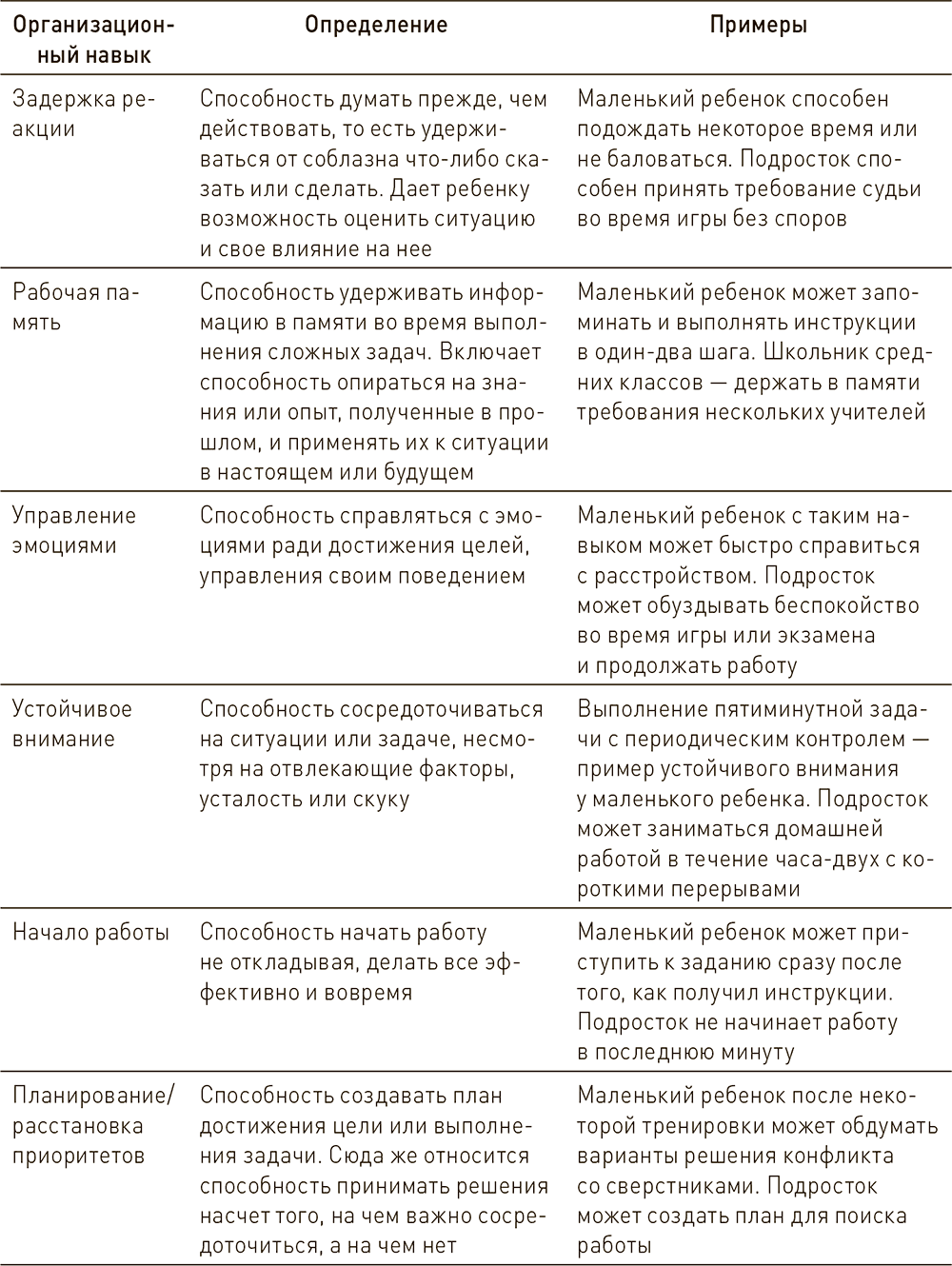 Эти навыки можно классифицировать двумя разными способами: по развитию (порядку, в котором они появляются у детей) и функциональности (в чем помогают). Знание порядка появления навыков помогает вам и учителям понимать, чего ожидать от ребенка в конкретном возрасте. Во время мастер-класса, который мы проводили несколько лет назад с воспитателями детских садов и учителями (начальная и средняя школа), мы попросили участников назвать два или три организационных навыка их подопечных, вызывающих у них наибольшее беспокойство. Учителя младших классов отметили навыки начала работы и устойчивого внимания, а средних — управление временем, организацию и планирование и расстановку приоритетов. Интересно, что учителя и начальной, и средней школы выбрали задержку реакции в качестве навыка, которого, по их мнению, недостает многим ученикам. Зная порядок развития навыков, вы не будете стремиться привить семилетнему ребенку навык, которым обычно удается овладеть годам к одиннадцати. У вас и так достаточно сложностей, не стоит ломиться в закрытую дверь.