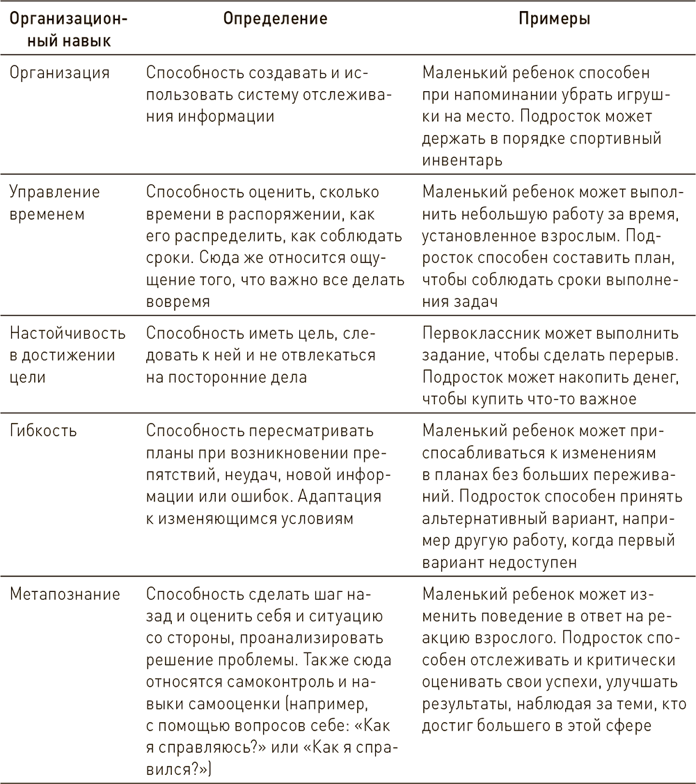 Существуют разные классификации организационных навыков, но наша модель была создана для достижения конкретной цели: разработать способы, благодаря которым родители и учителя помогут развить организационные навыки у своих детей.
