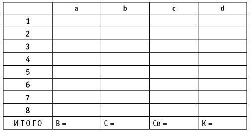 Шаг 3: ваши итоги показывают ваши предпочтения в отношении четырех главных репрезентативных систем (a = Визуальная, b = Слуховая, c = Слуховая внутренняя, d = Кинестетическая). Помните, что результаты теста отражают ваши предпочтения и ни в коей мере не отражают ваши истинные способности и личностные качества.
