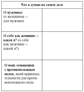 Поскольку здесь мы занимаемся только вопросами обустройства личной и семейной жизни и не касаемся денег, работы, отношений детей с родителями и многих других аспектов жизни людей, то и негативные утверждения будем рассматривать только из этой сферы. А таких убеждений может быть множество: «Я никому не нужна. Я слишком некрасивая (старая, молодая, высокая, низкая, умная, неумная, независимая, податливая и т. д. и т. п.), поэтому меня никто не полюбит. Женщин слишком много, мне ничего путного не достанется. Я рождена для страданий. У меня венец безбрачия (пояс девственности, чепец отверженности). Я не могу жить без семьи (хотя и живу). Терпеть не могу мужиков, но замуж выходить надо».