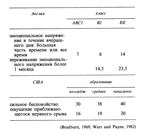 Одно из исследований, проведенных в Англии, показало, что из всех участвующих респондентов, принадлежащих к трем высшим социальным категориям в стране, 11 % испытывали в прошлом неприятное эмоциональное напряжение в течение 50% времени и более по сравнению с 14% опрошенных, принадлежащих к двум низшим категориям (Warr and Payne, 1982), Американские исследования дали аналогичные результаты (см. табл. 5.5).