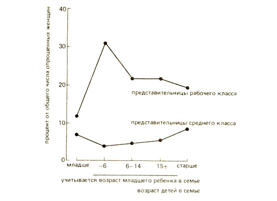 Многочисленные исследования, проведенные в США, Англии и других странах, показывают, что случаи шизофрении, депрессии, алкоголизма, наркомании и связанные с этим правонарушения наиболее распространены среди представителей рабочего класса. Для средних классов наиболее характерными отклонениями являются состояние тревожности и психотические расстройства, связанные с нарушениями эмоциональной сферы (Dohrenwend, 1975). В результате анализа случаев депрессии среди женщин (Англия) было установлено, что женщины из рабочей среды чаще страдают депрессией, чем женщины из средних классов, особенно при наличии дома маленьких детей (см. рис. 5.1) (Brown and Harris, 1978).