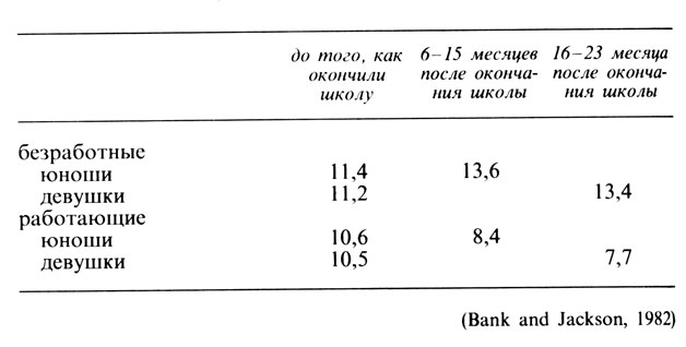 Воздействие безработицы на состояние психики обычно проявляется не сразу, для этого нужно какое-то время. Австралийское обследование, охватившее 400 молодых безработных, выявило, что около 56% из них имели клинические нарушения психики, причем в большинстве случаев с начала периода безработицы до появления симптомов проходило более 5 месяцев (Finlay-Jones and Eckhardt, 1981). Английское исследование также подтвердило, что состояние ментального и физического здоровья резко ухудшалось спустя полгода после потери работы (Warr and Jackson, 1984); американское исследование установило, что многие жены после 2-3-месячной безработицы своих мужей испытывали состояние обеспокоенности, тревоги по поводу своих социальных связей (человеческих взаимоотношений) (Liem and Atkinson, 1982, reported in Furnham and Lewis, 1986).