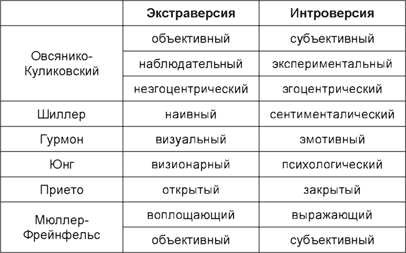 Еще более интересны типологии, предложенные немецким психологом Р. Мюллером-Фрейнфельсом (Мюллер-Фрейнфельс, 1923). Вслед за многими исследователями Мюллер-Фрейнфельс указывал на существование двух типов художников слова – «поэта воплощающего» и «поэта выражения». Для писателя первого типа материалом творчества служат переживания, при которых чувственный символ отходит на второй план. Поэт второго типа, по мнению Мюллера-Фрейнфельса, «насквозь пропитан субъективизмом» и никогда не создает истинного художественного произведения. Разделяя эти типы, он опирался на различие их типов мыслительной деятельности и интеллектуальной жизни. Вместе с тем он видел и другие критерии для деления писателей на типы.