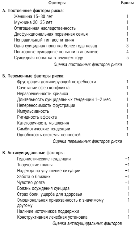 Оцените суицидный риск путем алгебраического сложения баллов (низкий суицидный риск – до 10 баллов, средний – от 10 до 15, высокий – более 15 баллов).