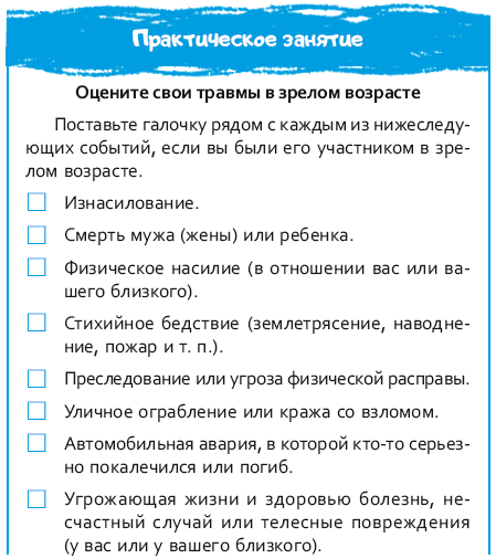 Травма – это событие, опасное для жизни или причиняющее физический вред вам или вашим близким. Сюда входит целый свод ИДО и прочие виды опыта жертвы: изнасилование, избиение, серьезная авария, опасная для жизни болезнь, участие в боевых действиях или борьба со стихийным бедствием. Примерно у 15 процентов переживших травму развивается полномасштабное посттравматическое стрессовое расстройство (ПТСР), среди остальных многие регулярно демонстрируют симптомы этого расстройства. Симптомы ПТСР включают в себя: