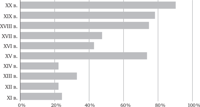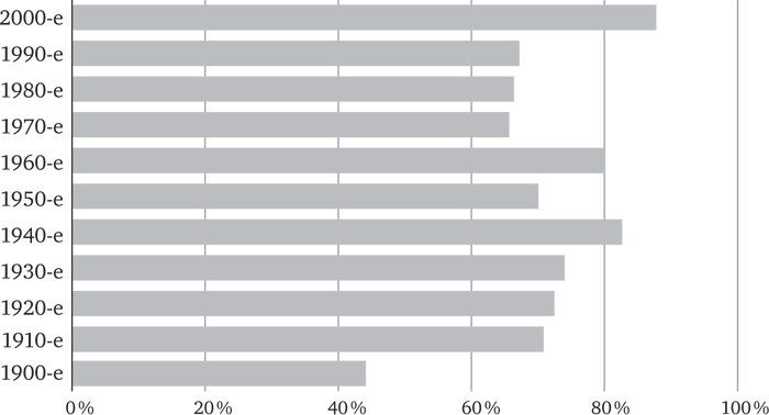 Затем показатели запоминаемости пошли на убыль. За первое десятилетие XX в. больше половины респондентов не смогли назвать ни одного важного исторического события.