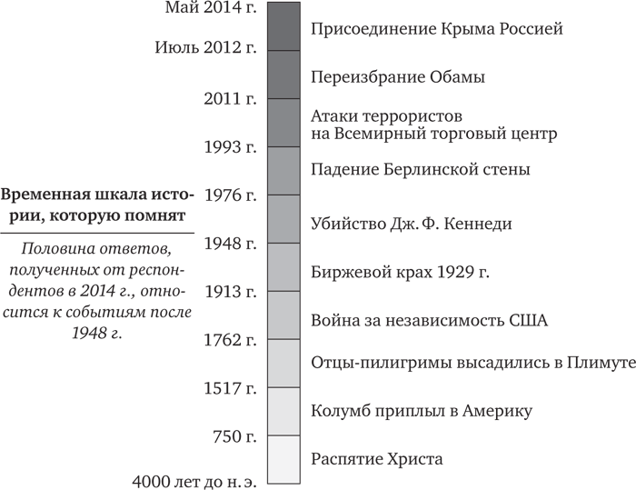 Ответ мог быть признан неверным по двум причинам. Кто-то называл события, которые никогда не происходили, например «к президенту Никсону применили импичмент». (Никсон, чтобы избежать этого позора, подал в отставку.) Но чаще ошибка заключалась в том, что реальное событие соотносили с другим временным периодом. Некоторые относили смерть Усамы бен Ладена к 2012 или 2010 вместо 2011 г. Это вполне понятно. Люди сходятся во мнениях насчет того, что с появлением Google необходимость запоминать даты уменьшилась и что достаточно иметь общее представление о том, какое событие за каким следует. Но среди испытуемых, участвовавших в моем исследовании, мало у кого оно было. Отвечали, что Колумб приплыл в Америку в начале XVII в., а ледниковый период был в первом тысячелетии до нашей эры.