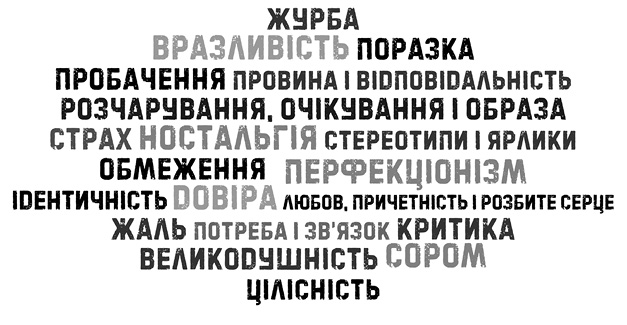 У наступних розділах ви побачите, що деякі із цих тем — це царини, які я досліджувала і добре знаю (наприклад, сором, провина і звинувачення), у той час як в інших темах, на кшталт пробачення і ностальгії, я сиджу на школярській лаві. Якщо теми перебувають за межами моєї ділянки дослідження, я познайомлю вас із людьми, які їх знають, і ми будемо вивчати їхні праці разом.