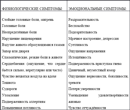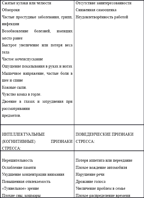 Можно выделить как минимум 4 группы симптомов стресса: физиологические, интеллектуальные, эмоциональные и поведенческие.