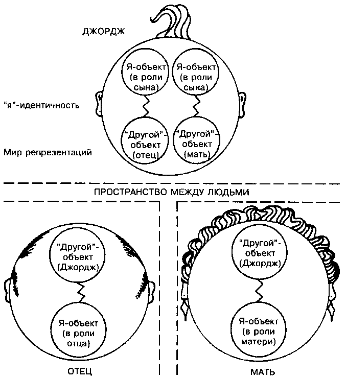 Для Джорджа каждая из этих сторон его общей самоидентичности затрагивала различные аспекты ролевого кластера «Якак сын». Однако каждая из этих субролей находилась в отношениях с иными «другой» — объектами: его отца или матери. Обе эти личности существовали внутри него в качестве внутренних объектов, с которыми его объекты (или сценарные Я) находились во взаимоотношениях.