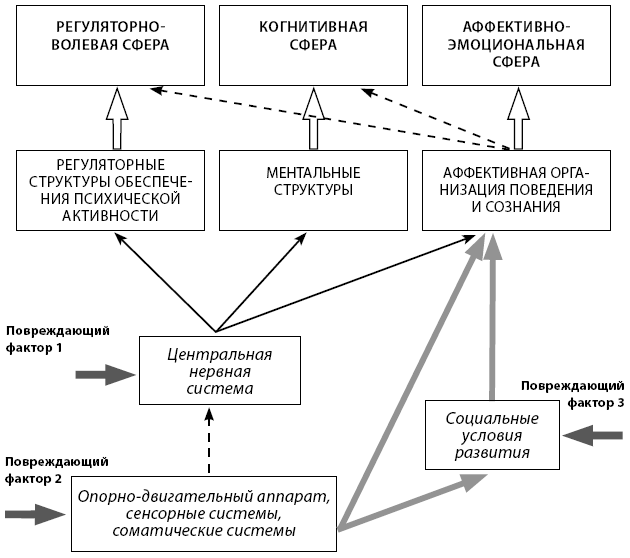 Первый фактор – это непосредственное повреждение ЦНС (в первую очередь головного мозга). В зависимости от специфики воздействия будут наблюдаться те или иные особенности повреждения и дальнейшего формирования базовых регулятивных и ментальных структур (показано тонкими черными стрелками). При повреждении определенных мозговых систем даже в детском, тем более в подростковом, возрасте можно говорить и об особенностях аффективной организации. В зависимости от этого будут наблюдаться те или иные особенности регуляторно-волевой, когнитивной и аффективно-эмоциональной сфер в целом.