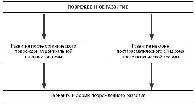 Вслед за классиками отечественной психиатрии и психологии к поврежденному мы относим варианты отклоняющегося развития, возникающие при патологическом повреждающем воздействии в первую очередь на ЦНС ребенка, когда значительная (большая) часть функциональных психических систем уже была сформирована до момента повреждения и психическое развитие имело определенный период условно-нормативного. Кроме того, предполагается, что в большинстве случаев можно выделить собственно повреждающий фактор и время его воздействия. В соответствии с представлениями Г.Е. Сухаревой и других авторов принято считать, что феномены повреждения возникают только при воздействии повреждающих факторов после возраста 2,5–3 лет, когда часть психических функций уже сформирована или находится в активной стадии формирования. При этом понятно, что именно фактор возраста, при котором возникло повреждение, играет огромную роль, поскольку длительность формирования той или иной психической функции или системы различна. Отсюда определяются дифференциально-диагностические признаки повреждения или недостаточности развития. Это имеет огромное значение для проведения дифференциальной диагностики не только психологом, но и другими специалистами.