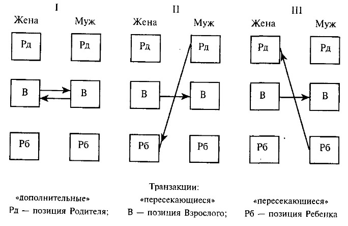 Жена обращается к мужу с информацией: «Я порезала палец» (апелляция к Взрослому с позиции Взрослого). Если он отвечает: «Сейчас перевяжем», то это ответ также с позиции Взрослого (I). Если же следует сентенция: «Вечно у тебя что-то случается», то это ответ с позиции Родителя (II), а в случае: «Что же я теперь должен делать?», демонстрируется позиция Ребенка (III). В двух последних случаях эффективность взаимодействия невелика (Крижанская, Третьяков, 1990). Аналогичный подход предложен и П.Н. Ершовым, который, обозначая позиции, говорит о возможной «пристройке сверху» и «пристройке снизу» (Ершов, 1972).