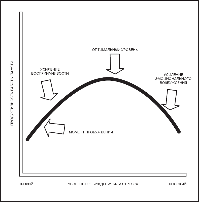 На примере закона Йеркса – Додсона мы видим взаимосвязь между уровнем эмоционального возбуждения и эффективностью работы восприятия и памяти. При очень низком уровне возбуждения, например утром, когда мы только проснулись, нервная система может функционировать не полностью, а сенсорные сообщения – не доходить до адресата. Самым оптимальным следует считать средний уровень возбуждения, если же он слишком высок, продуктивность начинает падать.