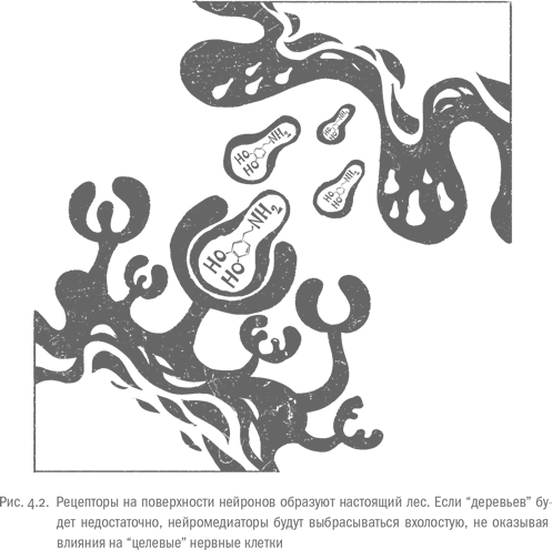 Потревоженный нейрон – назовем его нейрон 1 – выделяет дофамин в узкую щель между собой и следующим нейроном (нейрон 2). Поверхность нейрона 2, которая обращена к этой щели, утыкана всевозможными выростами, похожими на деревья без листьев, – это рецепторы. Их работа – ловить и удерживать вещества, болтающиеся в щели между нейронами. Каждый рецептор может схватить лишь одно вещество: форма его "веток" подходит только для конкретного нейромедиатора, остальные не втиснутся между ними либо, наоборот, будут вываливаться18.
