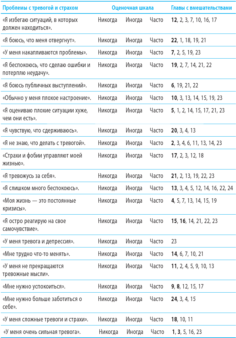 Заполнив опросник, сосредоточьте внимание на проблемах с тревогой или страхом, которые беспокоят вас больше всего. Числа справа означают главы этой книги, где вы найдете практические вмешательства для своих проблем; числа, выделенные полужирным шрифтом, означают главы, в которых содержится больше всего информации на эту тему.