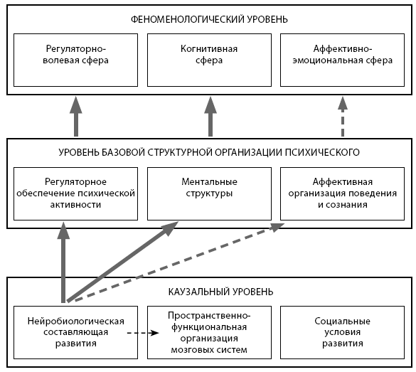 Каузальный уровень непосредственно влияет на базовую структурную организацию, ее компоненты – регуляторное обеспечение психической активности, ментальные структуры и аффективную организацию, которые в ситуации дефицитарности нейробиологической составляющей психического развития, а также особенностей других компонентов каузального уровня оказываются выраженно специфичными.