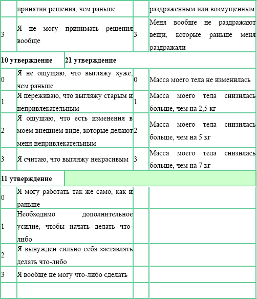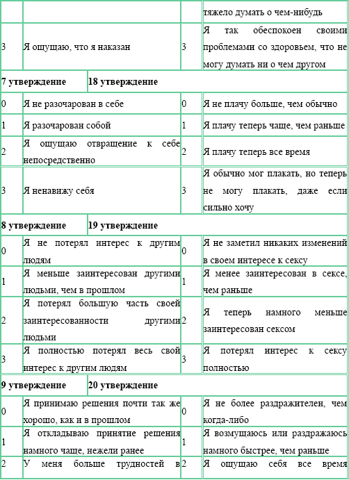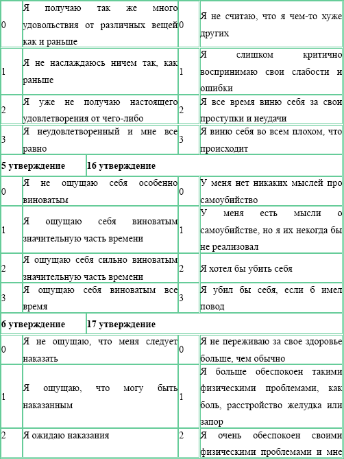 Инструкция. В приведенной ниже шкале Бека есть группы утверждений. Внимательно прочитайте каждую группу. Затем выберите в каждой группе одно утверждение, которое наилучше подходит к вашему состоянию последней недели. Если в группе несколько утверждений, которые подходят к вашему состоянию, учитывайте каждое из них.