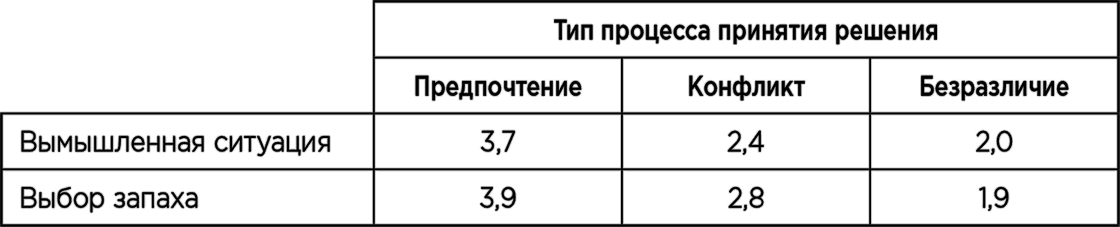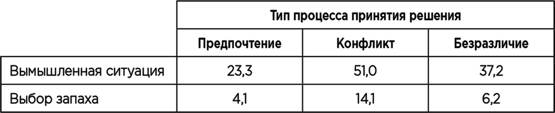 Все решения, принятые испытуемыми, были отнесены к одному из этих трех типов. Поскольку эта классификация очень важна для дальнейшего анализа, я хотел остановиться более подробно на рассмотрении некоторых объективных доказательств ее валидности. Если классификация имеет под собой основания, то можно ожидать, что величина временного отрезка, необходимого для принятия решения, будет заметно отличаться для трех категорий процесса осуществления выбора. В случае предпочтения отрезок времени, необходимый для принятия решения, должен быть относительно небольшим по той простой причине, что одна из альтернатив намного более привлекательна, чем другая. В случае безразличия отрезок времени, необходимый для принятия решения, также должен быть относительно небольшим, поскольку, хотя альтернативы и не сильно различаются по привлекательности, принимаемое решение имеет для человека невысокую значимость. Интервал же времени, необходимый для принятия решения в случае конфликта, должен быть достаточно большим. В табл. 4 представлены усредненные показатели времени, затраченного на принятие решения. Очевидно, что эти данные свидетельствуют в пользу проведенной классификации категорий процесса принятия решения. Как в условиях воображаемых ситуаций, так и при выборе между двумя запахами, интервал времени, затраченного на принятие решения конфликтного типа, был намного более продолжительным.