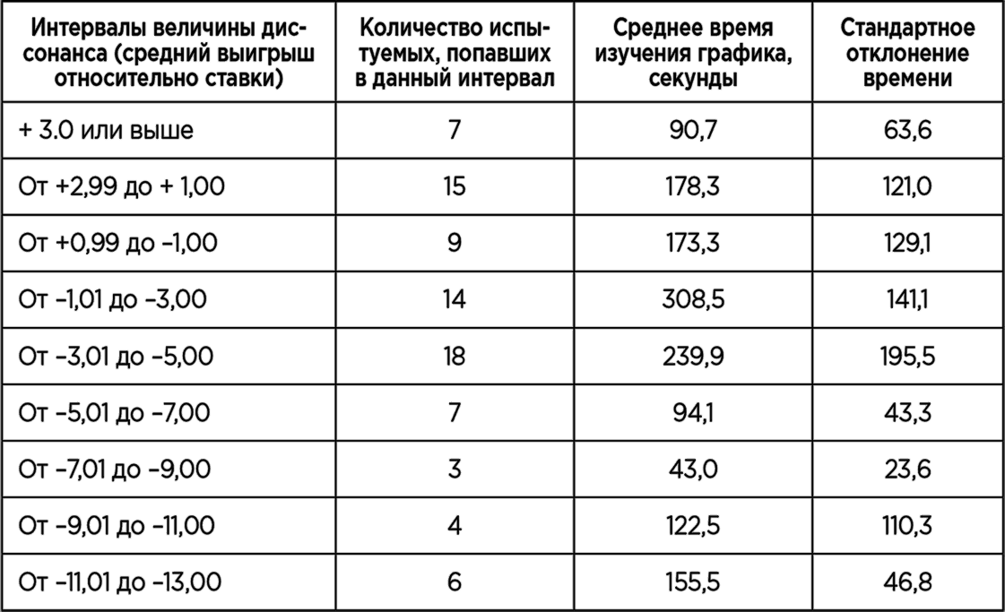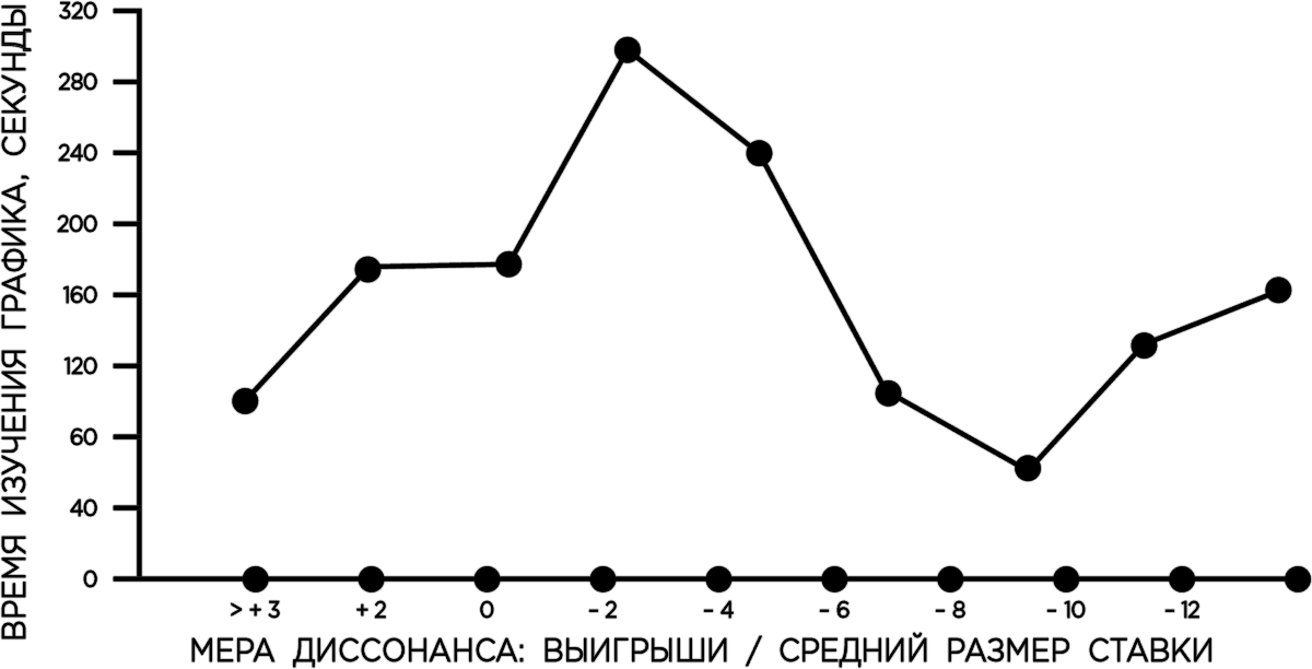 1. Мы предсказывали, что если отношения между знанием и поведением являются в существенной мере консонантными, то мы увидим незначительную или нулевую мотивацию к восприятию новой информации, представленной на графике. Как и ожидалось, в положительной части шкалы диссонанса количество времени, затраченное на изучение графика, было невелико. Иными словами, если опыт, полученный игроком, порождал знание, согласующееся со знанием о собственном поведении, этот участник проводил за изучением графика немного времени. Однако можно считать это предсказание подтвердившимся лишь частично, так как для небольшой или нулевой мотивации к изучению графика среднее значение, равное 178,3 секунды, представляется слишком большим. Можно было бы ожидать меньших временных затрат. Я еще вернусь к этому моменту.