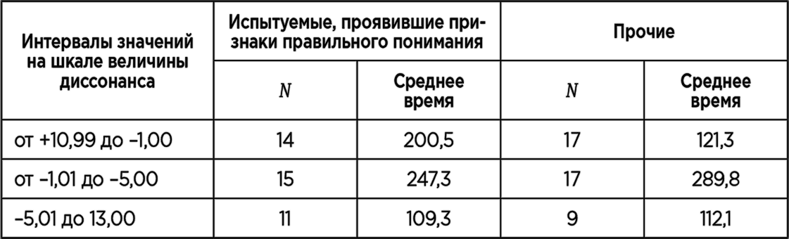 Вернемся теперь к рассмотрению сравнительно высоких значений среднего времени на положительном полюсе шкалы диссонанса. Поскольку теоретически можно ожидать незначительной или нулевой мотивации к поиску информации, следовало бы рассчитывать на то, что время изучения будет сравнительно небольшим, если, конечно, не сказывается влияние каких-либо других факторов. На самом деле оказывается возможным выявить тот дополнительный фактор, который привел к таким неожиданно высоким значениям. Вспомним, что график, предложенный испытуемым, будучи верно проинтерпретированным, должен был свидетельствовать о том, что избранная игроком сторона находится в проигрышном положении. Можно предположить, что среди участников, для которых диссонанс приобрел положительные значения, нашлись такие, которые, взглянув на график, просто потому, что экспериментатор предложил им на него посмотреть, сумели верно его истолковать и вследствие этого ощутили некоторый диссонанс в своей относительно консонантной системе знаний. В таком случае имел место факт невольного столкновения с порождающей диссонанс информацией. Однако это будет верно только для тех, у кого значения по шкале диссонанса были положительными. В табл. 21 приведено среднее время по двум группам испытуемых, переразбитое на такие интервалы, чтобы на каждом из них было достаточное количество случаев. Из этой таблицы отчетливо видно, что те испытуемые, чьи показатели расположились на положительной части шкалы диссонанса (интервал включает и 0) и кто при этом каким-либо образом проявил верное понимание графика, изучали его дольше. Различие тестировалось непараметрическими методами и было значимым на более чем пятипроцентном уровне.