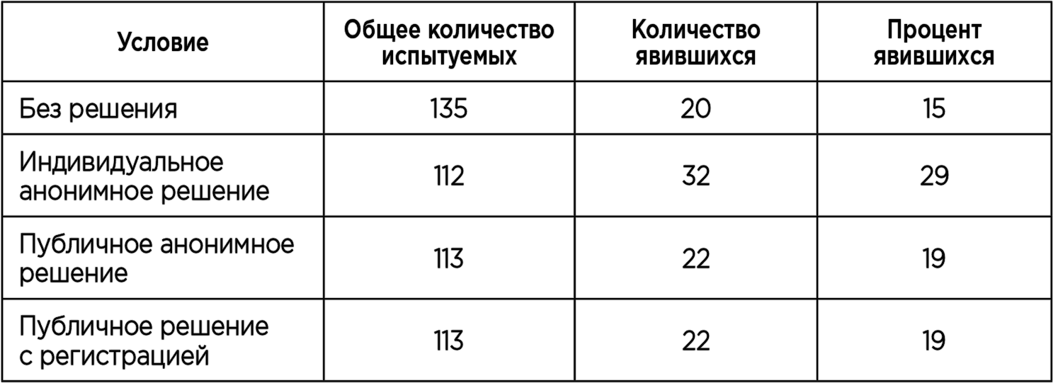 Внутри каждого из этих трех условий выделялось еще по четыре условия, касающихся принятия решения. В первой подгруппе испытуемые вообще не должны были ничего сообщать о каком-либо решении. Другую четверть испытуемых просили анонимно написать, собираются ли они принимать участие в экспериментах. В третьей подгруппе студенты могли сообщить о принятом решении поднятием руки, однако в этой группе экспериментатор не записывал фамилии тех, кто поднял руку. Условия в четвертой подгруппе были такими же, как в третьей, но экспериментатор открыто записывал фамилии тех студентов, которые захотели принять участие в экспериментах. Таким образом, было создано двенадцать различных условий, в которых один из трех вариантов метода убеждения (лекция, групповая дискуссия и отсутствие убеждения) комбинировался с одним из четырех вариантов способов сообщения о принятом решении (отсутствие сообщения, анонимное сообщение, публичное сообщение без регистрации и публичное сообщение с регистрацией). Эксперимент проводился в маленьких учебных подгруппах, поэтому стало возможным уравнять группы испытуемых, попавших в каждое из двенадцати условий, на основании результатов по опроснику, касающемуся их установок по поводу участия в психологических экспериментах. Заполнение опросника было проведено до начала исследования. Таким образом, можно считать, что с точки зрения желания быть добровольцем в психологическом эксперименте участники в разных группах исходно не различались.