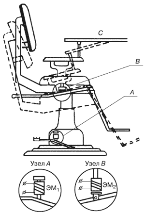 Блок вестибулярного воздействия (рис. 4) представляет собой стоматологическое кресло типа КВ-2, подвижная часть которого шарнирно связана с подвижной крышкой (С) стола специальной конструкции. Кресло имеет механизмы опускания (А) и опрокидывания (В), которые автоматически срабатывают при синхронном включении в цепь электромагнитов ЭМ1 и ЭМ2.