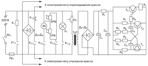 Работа блока автоматики. В исходном состоянии кнопка Кн1 разомкнута, питание на мультивибратор и усилитель не подается, контакты реле Р1 находятся в нормально открытом (Н. О.) состоянии, благодаря чему разорвана цепь питания катушки К1 и все его нормально открытые контакты (К1/1, К1/3, К1/4, К1/8) разомкнуты. Но при этом остается замкнутым контакт К7, питающий электромагнит опрокидывания кресла, благодаря чему кресло удерживается в крайнем верхнем положении.