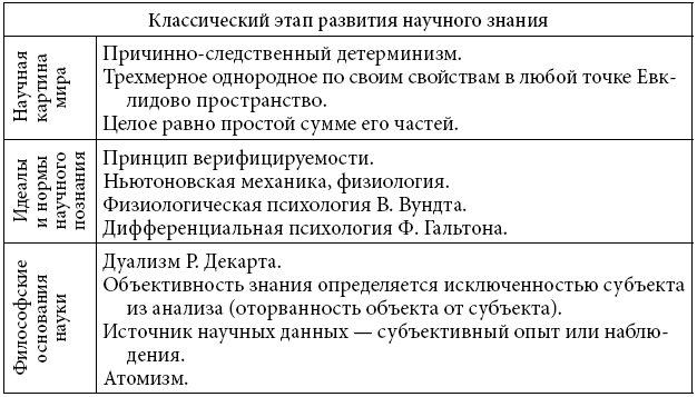 Каждый из этапов связан с именами выдающихся ученых того времени. Для этапа классической науки это Р. Декарт, И. Ньютон, Г.В. Лейбниц, Ф. Гальтон, В. Вундт, для неклассической – А. Эйнштейн, М. Борн, В. Гейзенберг, Н. Бор. В психологии это З. Фрейд, Л.С. Выготский, А. Гезелл, Ж. Пиаже и многие другие.