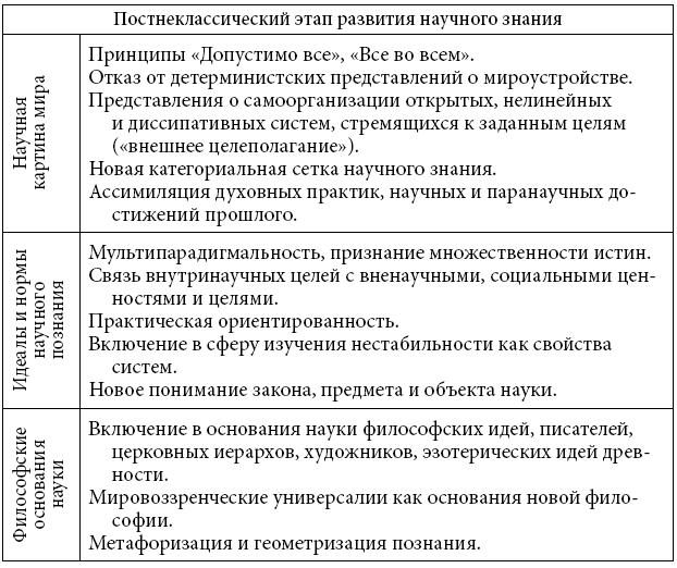 В онтологической составляющей философских оснований науки начинает доминировать категориальная матрица, обеспечивающая познание развивающихся объектов. Возникает новое понимание категорий пространства и времени (учет исторического времени системы, иерархии пространственно-временных форм), возможности и действительности (идея множества потенциально возможных линий развития в точках бифуркации), детерминации (предшествующая история определяет избирательное реагирование системы на внешние воздействия) и др. Основные характеристики постнеклассического этапа изложены в таблице 3.3.