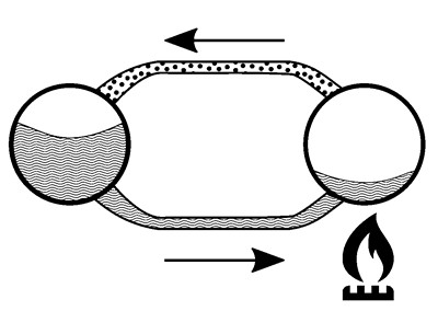 Рис. 5.10a. Алхимическая аналогия. Представления изображены как реторты, соединенные двумя трубками. Вторая реторта нагревается, пар поступает по трубке в первую и конденсируется. Из первой реторты жидкость по каппиляру поступает во вторую. Разность уровней жидкостей в ретортах поддерживается постоянным.