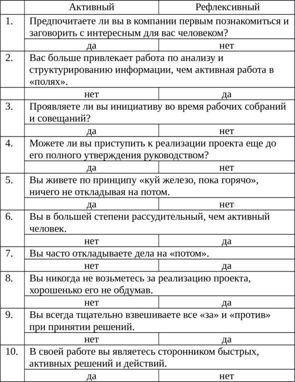 Выявление метапрограммы «Стиль реагирования» основывается на определении описанных в этом разделе ее характеристик. Данная метапрограмма во многом зависит от основных характеристик нервной системы человека, то есть она почти не зависит от контекста. Вопросы, которые мы приводим для определения ведущей референции, являются скрининговыми и позволяют предварительно оценить свойственную внеконтекстуальную референцию интересующего вас человека.