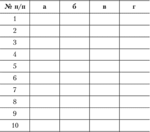 Инструкция. Перед вами опросник, включающий 10 вопросов. На каждый из них вам нужно дать ответ с учетом того, какой из них вам больше или меньше всего подходит. Если вам «свойственен» какой-либо ответ («а», «б», «в» или «г»), то в бланке для ответов против соответствующей буквы поставьте крестик.