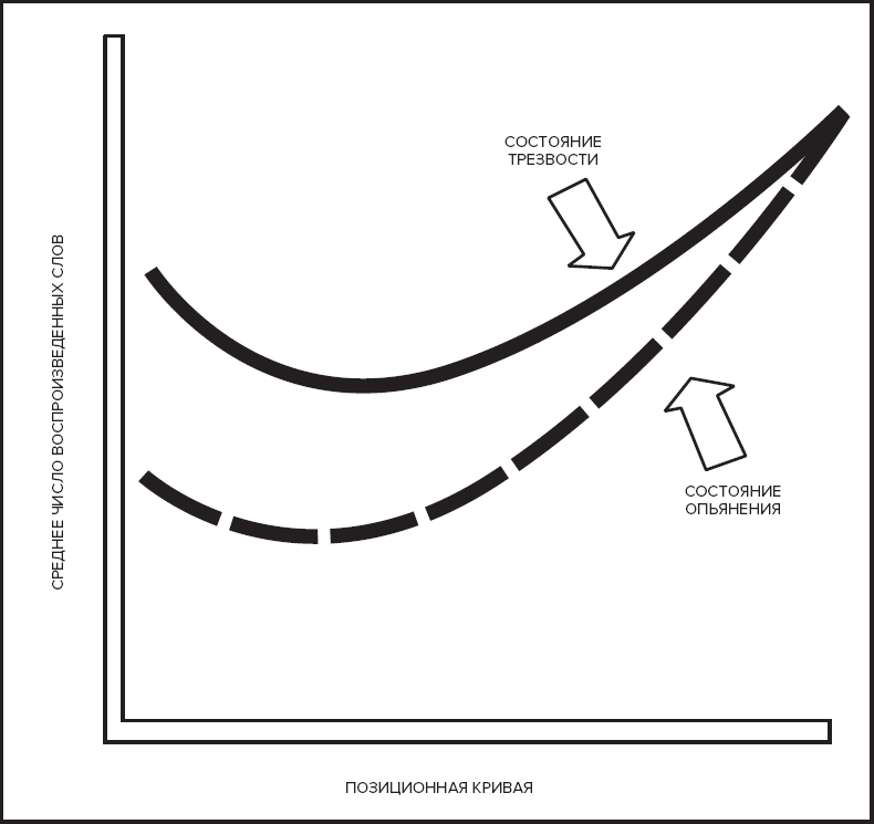 Определенный интерес представляет вопрос о том, влияет ли алкоголь каким-либо образом на форму позиционной кривой. Напомним, что если вам необходимо выучить список предметов, как правило, легче всего запоминаются первые и последние пункты. Ряд исследователей поставили перед собой задачу выяснить, работает ли этот принцип, когда человек находится в состоянии алкогольного опьянения.[64]