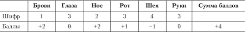 Обработка результатов. Оценка результатов производится в диапазоне от +2 до –2 по каждой части лица. Детали бровей, носа и шеи слева направо оценивается так: +2, +1, 0, –1, –2; глаз, рта и рук: –2, –1, 0, +1, +2. На основе этого подсчитывается общее количество баллов выданной «мишени».